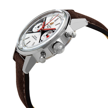 Stainless steel case with a brown leather strap. Fixed stainless steel bezel. Cream and black dial with luminous red hands and index hour markers. Minute markers. 1/100th second around the outer rim. Dial Type: Analog. Luminescent hands and markers. Chronograph - two sub-dials displaying: 60 second and 30 minute. Breitling calibre 23 automatic movement, based upon ETA 7753, containing 27 Jewels, bitting at 28800 vph, and has a power reserve of approximately 42 hours. Scratch resistant sapphire crystal. Pull / push crown. Solid case back. Round case shape. Case size: 41 mm. Case thickness: 14.27 mm. Band width: 20 mm / 18 mm. Tang clasp. Water resistant at 30 meters / 100 feet. Functions: chronograph, hour, minute, second. Top Time Limited Edition Series. Luxury watch style. Watch label: Swiss Made. Breitling Top Time Limited Edition Chronograph Automatic Men's Watch A23310121G1X1.
