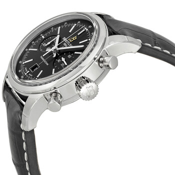 Stainless steel case with a black crocodile leather strap. Fixed stainless steel bezel. Black dial with silver-toned hands and index hour markers. Minute markers. tachymeter around the outer rim. Dial Type: Analog. Luminescent hands and markers. Date display at the 6 o'clock position. Chronograph - two sub-dials displaying: 60 second and 30 minute. Automatic movement. Breitling 41 engine. Scratch resistant sapphire crystal. Pull / push crown. Solid case back. Case diameter: 42 mm. Round case shape. Band width: 20 mm. Deployment clasp. Water resistant at 100 meters / 330 feet. Functions: chronograph, date, hour, minute, second. Luxury watch style. Watch label: Swiss Made. Breitling Transcocean Chronograph Automatic Men's Watch A4131012-BC06BKCT.