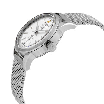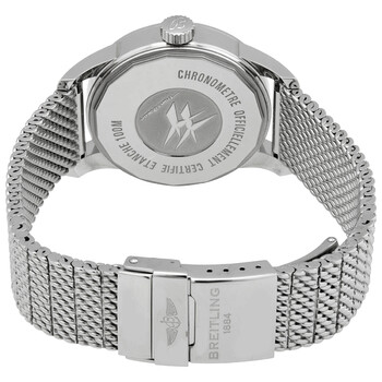 Silver-tone stainless steel case with a silver-tone stainless steel mesh bracelet. Fixed silver-tone stainless steel bezel. Silver dial with silver-tone hands and index hour markers. Dial Type: Analog. Luminescent hands and markers. Date display at the 12 o'clock position. One subdial displaying: small second. Breitling Calibre 16 Automatic movement, based upon ETA 2892-A2, containing 30 Jewels, bitting at 28800 vph, and has a power reserve of approximately 42 hours. Scratch resistant sapphire crystal. Solid case back. Round case shape, case size: 38 mm, case thickness: 13 mm. Folding clasp. Water resistant at 100 meters / 330 feet. Functions: big date, hour, minute, second. Transocean 38 Series. Luxury watch style. Watch label: Swiss Made. Breitling Transocean 38 Automatic Silver Dial Men's Watch A1631012-G781-171A.