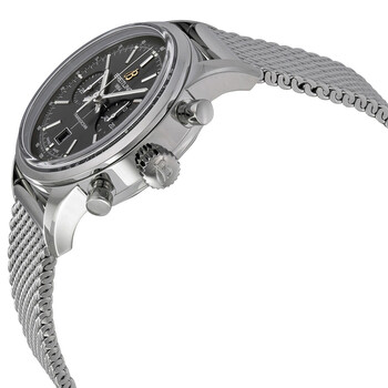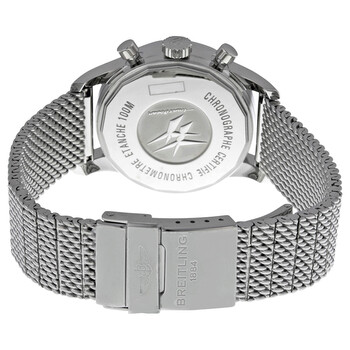 Stainless steel case with a stainless steel (ocean classic) bracelet. Fixed stainless steel bezel. Black dial with silver-tone hands and index hour markers. Minute markers. tachymeter around the outer rim. Dial Type: Analog. Luminescent hands and markers. Date display at the 6 o'clock position. Chronograph - two sub-dials displaying: 60 second and 30 minute. Self winding mechanical movement. Breitling 41 engine. Scratch resistant sapphire crystal. Pull / push crown. Solid case back. Case diameter: 38 mm. Case thickness: 14.25 mm. Round case shape. Band width: 20 mm. Deployment clasp. Water resistant at 100 meters / 330 feet. Functions: chronograph, date, hour, minute, second. Casual watch style. Watch label: Swiss Made. Breitling TransOcean 38 Chronograph Black Dial Stainless Steel Watch A4131012-BC06SS.