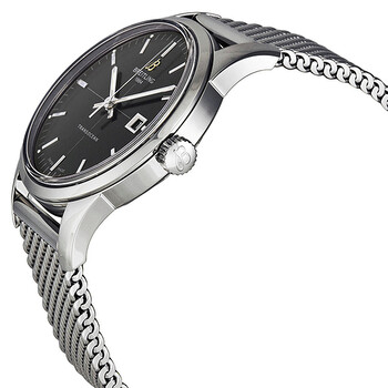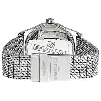 Stainless steel case with a stainless steel bracelet. Fixed stainless steel bezel. Black dial with luminous silver-tone hands and index hour markers. Minute markers around the outer rim. Dial Type: Analog. Luminescent hands and markers. Date display at the 3 o'clock position. Automatic movement. Scratch resistant sapphire crystal. Pull / push crown - two gaskets. Solid case back. Case diameter: 43 mm. Case thickness: 11.35 mm. Round case shape. Band width: 20 mm / 22 mm. Double locking clasp. Water resistant at 50 meters / 165 feet. Functions: date, hour, minute, second. Dress watch style. Watch label: Swiss Made. Breitling Transocean Black Dial Stainless Steel Men's Watch A1036012-BA91SS.