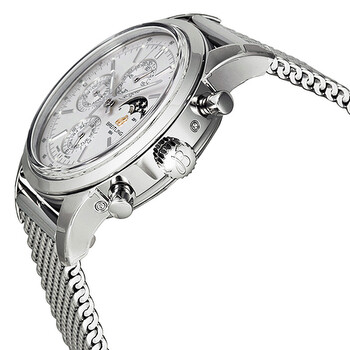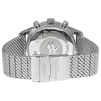 Stainless steel case with a stainless steel mesh bracelet. Fixed stainless steel bezel. Mercury silver dial with silver-tone hands and index hour markers. Minute markers. Tachymeter around the outer rim. Dial Type: Analog. Luminescent hands and markers. Chronograph / Multi-Function - three dual sub-dials displaying: 60 seconds and date, 30 minutes and month, 12 hours and day of the week. Moon phase display at the 3 o'clock position. Automatic movement with a 42-hour power reserve. Scratch resistant sapphire crystal. Non screw locked crown - two gaskets. Solid case back. Case diameter: 43 mm. Case thickness: 15.25 mm. Round case shape. Band width: 22 mm / 20 mm. Deployment clasp with a push button release. Water resistant at 100 meters / 330 feet. Functions: chronograph, date, day, 24 hour, hour, minute, second. Luxury watch style. Watch label: Breitling Transocean Chronograph 1461 Automatic Men's Watch A1931012-G750SS
