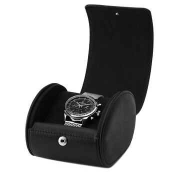 Stainless steel case with a black leather strap. Fixed stainless steel bezel. Black dial with silver-tone hands and index hour markers. Minute markers. Tachymeter around the outer rim. Dial Type: Analog. Luminescent hands and markers. Date display at the 6 o'clock position. Chronograph - two sub-dials displaying: 60 second and 30 minute. Automatic movement with a 42 hour power reserve. Scratch resistant sapphire crystal. Pull / push crown. Solid case back. Case diameter: 38 mm. Case thickness: 14 mm. Round case shape. Band width: 18 mm / 20 mm. Band length: 7.5 inches. Tang clasp. Water resistant at 100 meters / 330 feet. Functions: chronograph, tachymeter, date, hour, minute, second. Luxury watch style. Watch label: Swiss Made. Breitling Transocean Chronograph 38 Black Dial Black Leather Men's Watch A4131012-BC06BKSLT.