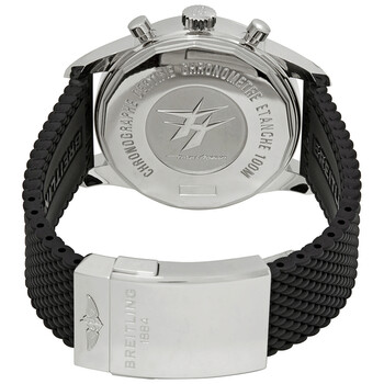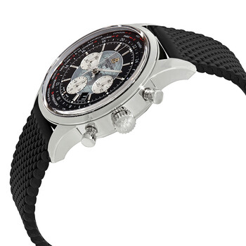 Stainless steel case with a black rubber strap. Fixed stainless steel bezel. Black dial with a globe design with luminous silver-tone hands and index hour markers. Minute markers. 24 hour markers. World time cities around the outer rim. Dial Type: Analog. Luminescent hands and markers. Date display between the 4 and 5 o'clock positions. Chronograph - three sub-dials displaying: 60 second, 30 minute and 12 hours. Breitling calibre 05 automatic movement with a 70-hour power reserve. Scratch resistant sapphire crystal. Screw down crown. Solid case back. Round case shape. Case size: 46 mm. Case thickness: 15.4 mm. Band width: 24 mm. Deployment clasp with a push button release. Water resistant at 100 meters / 330 feet. Functions: GMT, second time zone, hour, minute, second, chronograph. Luxury watch style. Watch label: Swiss Made. Breitling Transocean Chronograph Automatic Black Dial Men's Watch AB0510U4/BB62-256S.