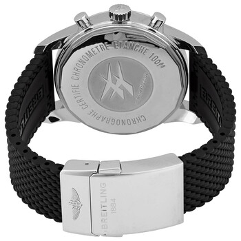 Silver-tone stainless steel case with a black rubber (aero classic) strap. Fixed silver-tone stainless steel bezel. Black (globe) dial with luminous black hands and index hour markers. Minute markers. 24 hour markers. World time cities around the outer rim. Dial Type: Analog. Luminescent hands and markers. Date display between the 4 and 5 o'clock positions. Chronograph - three sub-dials displaying: 60 second, 30 minute and 12 hour. Breitling Calibre 05 Automatic movement, based upon Breitling Calibre 01, containing 56 Jewels, bitting at 28800 vph, and has a power reserve of approximately 70 hours. Scratch resistant sapphire crystal. Pull / push crown. Solid case back. Round case shape, case size: 46 mm, case thickness: 15.4 mm. Fold over with push button release clasp. Water resistant at 100 meters / 330 feet. Functions: chronograph, date, hour, minute, second, world time. Transocean Series. Luxury watch style. Watch label: Swiss Made. Breitling Transocean Chronograph Automatic Black Dial Men's Watch AB0510U4-BE84-256S-A20D.2.