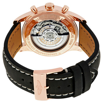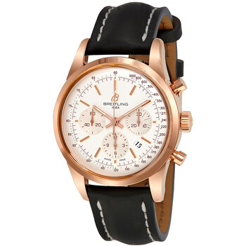 18kt rose gold case with a black (calfskin) leather strap. Fixed 18kt rose gold bezel. Mercury silver dial with gold-toned hands and index hour markers. Minute markers. Tachymeter markings around the outer rim. Dial Type: Analog. Luminescent hands and markers. Date display between the 4 and 5 o'clock positions. Chronograph - three sub-dials displaying: 60 second, 30 minute and 12 hour. Breitling calibre 01 automatic movement with a 70-hour power reserve. Scratch resistant sapphire crystal. Push / pull crown. Transparent case back. Round case shape. Case size: 43 mm. Case thickness: 14.35 mm. Band width: 22 mm. Tang clasp. Water resistant at 100 meters / 330 feet. Functions: chronograph, chronometer, date, hour, minute, second. Luxury watch style. Watch label: Swiss Made. Item Variations: RB015212 G738, RB015212.G738, RB015212G738. Breitling Transocean Silver Dial Chronograph 18kt Rose Gold Black Leather Men's Watch RB015212-G738.