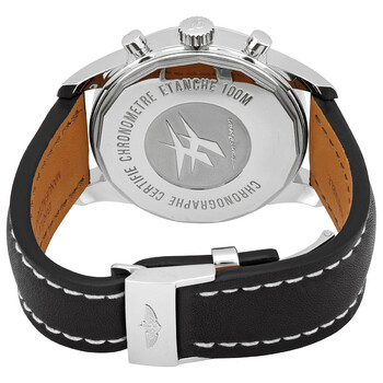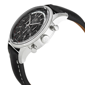 Stainless steel case with a black leather strap. Fixed stainless steel bezel. Black (globe) dial with luminous silver-tone hands and index hour markers. Minute markers. Rotating 24 hour markers. World time cities around the outer rim. Dial Type: Analog. Luminescent hands and markers. Date display between the 4 and 5 o'clock positions. Chronograph - three sub-dials displaying: 60 second, 30 minute and 12 hour. Breitling calibre 05 automatic movement, based upon Breitling calibre 01, containing 56 Jewels, bitting at 28800 vph, and has a power reserve of approximately 70 hours. Scratch resistant sapphire crystal. Screw locked crown. Solid case back. Round case shape. Case size: 46 mm. Case thickness: 15.4mm. Band width: 24 mm. Tang clasp. Water resistant at 100 meters / 330 feet. Functions: GMT, world time zone,rotating disc with 24 world city time zones, hour, minute, second, date. Transocean Chronograph Unitime Series. Luxury watch style. Watch label: Swiss Made. Breitling Transocean Chronograph Unitime Automatic Black Dial Men's Watch AB0510U4/BE84 442X/A20D.1.