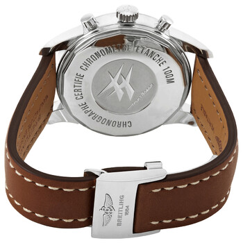 Silver-tone stainless steel case with a brown (calfskin) leather strap. Fixed silver-tone stainless steel bezel. Polar white dial with luminous silver-tone hands and index hour markers. Minute markers. 24 hour markers. World time cities around the outer rim. Dial Type: Analog. Luminescent hands and markers. Date display between 4 and 5 o'clock position. Chronograph - three sub-dials displaying: 60 second, 30 minute and 12 hours. Breitling Calibre 05 Automatic movement, based upon Breitling Calibre 01, containing 56 Jewels, bitting at 28800 vph, and has a power reserve of approximately 70 hours. Scratch resistant sapphire crystal. Pull / push crown. Solid case back. Round case shape, case size: 46 mm, case thickness: 15.40 mm. Band width: 24 mm. Deployment clasp. Water resistant at 100 meters / 330 feet. Functions: GMT, rotating disc with 24 world city time zones, hour, minute, second, date, chronograph. Transocean Chronograph Unitime Series. Luxury watch style. Watch label: Swiss Made. Breitling Transocean Chronograph Unitime Automatic Men's Watch AB0510U0/A732-440X/A20D.1.