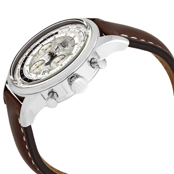 Stainless steel case with a brown leather strap. Fixed stainless steel bezel. White (globe) dial with luminous silver-tone hands and index hour markers. Minute markers. Rotating 24 hour markers. World time cities around the outer rim. Dial Type: Analog. Luminescent hands and markers. Date display between the 4 and 5 o'clock positions. Chronograph - three sub-dials displaying: 60 second, 30 minute and 12 hour. Breitling calibre 05 automatic movement, based upon Breitling calibre 01, containing 56 Jewels, bitting at 28800 vph, and has a power reserve of approximately 70 hours. Scratch resistant sapphire crystal. Screw locked crown. Solid case back. Round case shape. Case size: 46 mm. Case thickness: 15.4mm. Band width: 24 mm. Tang clasp. Water resistant at 100 meters / 330 feet. Functions: GMT, world time zone,rotating disc with 24 world city time zones, hour, minute, second, date. Transocean Chronograph Unitime Series. Luxury watch style. Watch label: Swiss Made. Breitling Transocean Chronograph Unitime Automatic White Dial Men's Watch AB0510U0/A790 443X-A20BA.1.