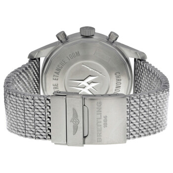 Stainless steel case with a stainless steel mesh bracelet. Fixed stainless steel bezel. Blue dial with luminous silver-toned hands and index hour markers. An Arabic numeral appears at the 12 o'clock position. Minute markers. 24 hour markers. World time around the outer rim. Dial Type: Analog. Luminescent hands and markers. Date display between the 4 and 5 o'clock positions. Chronograph - three sub-dials displaying: 60 second, 30 minute and 12 hour. Automatic movement with a 70-hour power reserve. Scratch resistant sapphire crystal. Screw down crown. Solid case back. Case diameter: 46 mm. Case thickness: 15.25 mm. Round case shape. Band width: 20 mm / 22 mm. Deployment clasp. Water resistant at 100 meters / 330 feet. Functions: chronograph, date, hour, minute, second. Luxury watch style. Watch label: Swiss Made. Breitling Transocean Chronograph Unitime Blue Dial stainless Steel Men's Watch AB0510U9-C879SS.