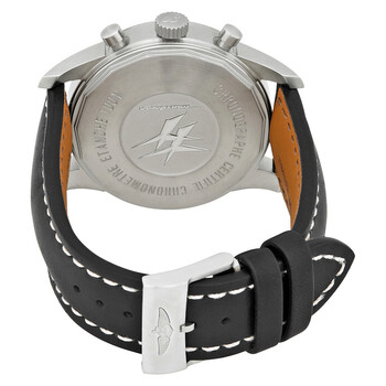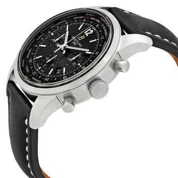Stainless steel case with a black leather strap. Fixed stainless steel bezel. Black dial with luminous silver-tone hands and index hour markers. An Arabic numeral marks the 12 o'clock position. Minute markers. 24 hour markings. World time around the outer rim. Dial Type: Analog. Luminescent hands and markers. Date display between the 4 and 5 o'clock positions. Chronograph - three sub-dials displaying: 60 second, 30 minute and 12 hour. Breitling calibre 05 automatic movement with a 70-hour power reserve. Scratch resistant sapphire crystal. Pull / push crown. Solid case back. Round case shape. Case size: 46 mm. Case thickness: 15.25 mm. Tang clasp. Water resistant at 100 meters / 330 feet. Functions: chronograph, date, GMT, second time zone, hour, minute, second, world time. Luxury watch style. Watch label: Swiss Made. Breitling Transocean Chronograph Unitime Pilot Black Dial Men's Watch AB0510U6-BC26BKLT.
