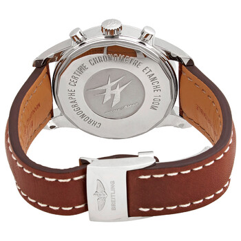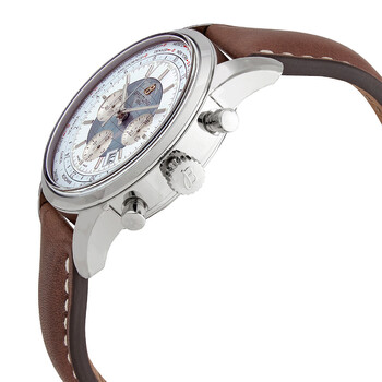 Stainless steel case with a brown leather strap. Fixed stainless steel bezel. White dial with luminous silver-tone hands and stick hour markers. Minute markers. 24 hour scale(rotating disk). World time cities around the outer rim. Dial Type: Analog. Luminescent hands and markers. Date display between the 4 and 5 o'clock positions. Chronograph - three sub-dials displaying: 60 second, 30 minute and 12 hour. Breitling calibre 05 automatic movement, based upon Breitling calibre 01, containing 56 Jewels, bitting at 28800 vph, and has a power reserve of approximately 70 hours. Scratch resistant sapphire crystal. Pull / push crown. Solid case back. Round case shape. Case size: 46 mm. Case thickness: 15.4 mm. Band width: 24 mm. Deployment clasp. Water resistant at 100 meters / 330 feet. Functions: chronograph, date, GMT, second time zone, hour, minute, second, world time. Transocean Chronograph Unitime Series. Travel watch style. Watch label: Swiss Made. Breitling Transocean Chronograph Unitime World Time Automatic White Dial Men's Watch AB0510U0/A732/444X/A20D.1.