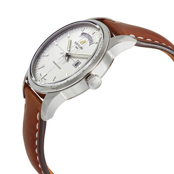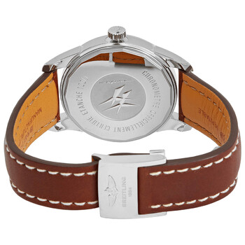 Silver-tone stainless steel case with a brown (calfskin) fleather strap. Fixed stainless steel bezel. Silver dial with luminous silver hands and index hour markers. Minute markers around the outer rim. Dial Type: Analog. Luminescent hands and markers. Date display at the 3 o'clock position. Day of the week display centered on the 12 o'clock position. Breitling calibre 45 automatic movement, based upon ETA 2834-2, containing 25 Jewels, bitting at 28800 vph, and has a power reserve of approximately 42 hours. Scratch resistant sapphire crystal. Pull / push crown. Screw in case back. Round case shape. Case size: 43 mm. Case thickness: 12.8mm. Band width: 22 mm. Deployment clasp. Water resistant at 100 meters / 330 feet. Functions: date, day, hour, minute, second. Transocean Day & Date Series. Luxury watch style. Watch label: Swiss Made. Breitling Transocean Day Date Automatic Silver Dial Men's Watch A4531012/G751/438X/A.