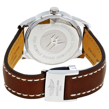 Silver-tone stainless steel case with a brown leather strap. Fixed silver-tone stainless steel bezel. Mercury silver dial with luminous silver hands and index hour markers. Minute markers around the outer rim. Dial Type: Analog. Luminescent hands and markers. Date display at the 3 o'clock position. day of the week display centered on the 12 o'clock position. Breitling Calibre 45 Automatic movement, based upon ETA 2834-2, containing 25 Jewels, bitting at 28800 vph, and has a power reserve of approximately 42 hours. Scratch resistant sapphire crystal. Pull / push crown. Screw in case back. Round case shape, case size: 43 mm, case thickness: 12.8 mm. Band width: 22-20 mm. Deployment clasp. Water resistant at 100 meters / 330 feet. Functions: date, day, hour, minute, second. Transocean Day & Date Series. Luxury watch style. Watch label: Swiss Made. Item Variations: A4531012/G751 740P-A20D.1. Breitling Transocean Day-Date Automatic Men's Watch A4531012-G751BRLD.
