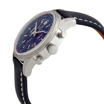 Stainless steel case with a blue (crocodile) leather strap. Fixed stainless steel bezel. Midnight blue dial with luminous silver-tone hands and index hour markers. Arabic numeral appears at the 12 o'clock position. Minute markers. 24 hour markers. World time cities displayed around the outer rim. World time cities around the outer rim. Dial Type: Analog. Luminescent hands and markers. Date display between the 4 and 5 o'clock positions. Chronograph - three sub-dials displaying: 60 second, 30 minute and 12 hour. Breitling calibre 05 automatic movement, based upon Breitling calibre 01, containing 56 Jewels, bitting at 28800 vph, and has a power reserve of approximately 70 hours. Scratch resistant sapphire crystal. Screw down crown. Solid case back. Round case shape. Case size: 46 mm. Case thickness: 15.40 mm. Band width: 24 mm. Tang clasp. Water resistant at 100 meters / 330 feet. Functions: GMT, second time zone, hour, minute, second, date. Transocean Unitime Pilot Series. Pilot watch style. Watch label: Swiss Made. Breitling Transocean Unitime Pilot Automatic Men's Watch AB0510U9/C879/102X/A.