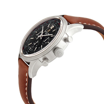 Stainless steel case with a brown leather strap. Fixed stainless steel bezel. Black dial with luminous silver-tone hands and index hour markers. Arabic numeral appears at the 12 o'clock position. Minute markers. (Rotating) 24 hour markings. World time around the outer rim. Dial Type: Analog. Luminescent hands and markers. Date display between the 4 and 5 o'clock positions. Chronograph - three sub-dials displaying: 60 second, 30 minute and 12 hour. Breitling calibre 05 automatic movement, based upon Breitling calibre 01, containing 56 Jewels, bitting at 28800 vph, and has a power reserve of approximately 70 hours. Scratch resistant sapphire crystal. Pull / push crown. Solid case back. Round case shape. Case size: 46 mm. Case thickness: 15.4 mm. Band width: 24 mm. Fold over clasp. Water resistant at 100 meters / 330 feet. Functions: chronograph, column wheel, world time, date, hour, minute, small second, chronometer. Transocean Unitime Pilot Series. Luxury watch style. Watch label: Swiss Made. Breitling Transocean Unitime Pilot World Time Chronograph Automatic Chronometer Black Dial Men's Watch AB0510U6/BC26/438X/A20D.1.