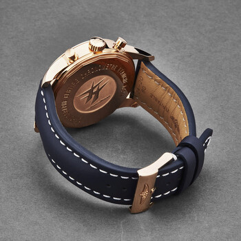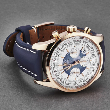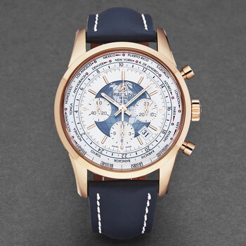 18kt rose gold case with a blue crocodile leather strap. Fixed 18kt rose gold bezel. White dial with index hour markers. Minute marker. World time cities around the outer rim. Dial Type: Analog. Luminescent hands and markers. Date display between 4 and 5 o'clock position. Chronograph - three sub-dials displaying: 60 second, 30 minute and 12 hour. Breitling Calibre 05 Automatic movement, based upon Breitling Calibre 01, containing 56 Jewels, bitting at 28800 vph, and has a power reserve of approximately 70 hours. Scratch resistant sapphire crystal. Pull / push crown. Solid case back. Round case shape, case size: 46 mm. Tang clasp. Water resistant at 100 meters / 330 feet. Functions: chronograph, date, GMT, second time zone, hour, minute, second, world time. Transocean Unitime Series. Travel watch style. Watch label: Swiss Made. Breitling Transocean Unitime World Time Chronograph Automatic White Dial Men's Watch RB0510U0/A733CS.