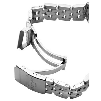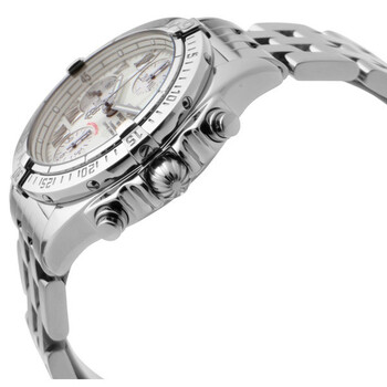 Stainless steel case with a stainless steel bracelet. Unidirectional rotating stainless steel bezel. Ivory dial with luminous silver-tone hands and luminous Roman numeral hour markers. Minute markers around the outer rim. Dial Type: Analog. Luminescent hands and dial markers. Date display at the 3 o'clock position. Chronograph - three sub-dials displaying: 60 second, 30 minute and 12 hour. Breitling calibre 13 automatic movement with a 42-hour power reserve. Scratch resistant sapphire crystal. Screw locked crown. Solid case back. Round case shape. Case size: 39 mm. Case thickness: 14.8 mm. Band width: 20 mm / 18 mm. Band length: 8.5 inches. Deployment clasp. Water resistant at 100 meters / 330 feet. Functions: chronograph, chronometer, date, hour, minute, second. Additional Info: chronograph; date displays at 3 o'clock position. Luxury watch style. Watch label: Certifie Chronometre. Item Variations: A1335812. Breitling Windrider Chrono Cockpit Mother of Pearl Dial Men's Watch A1335812-A596SS.