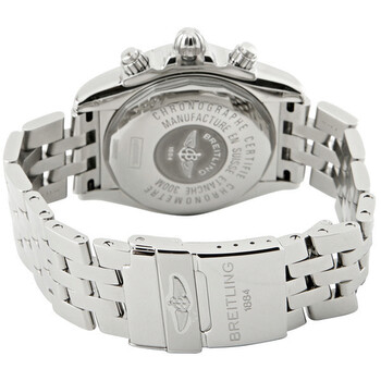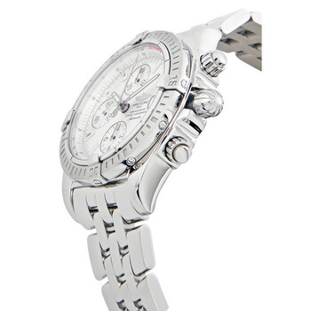 Silver-tone stainless steel case with a silver-tone stainless steel bracelet. Uni-directional rotating silver-tone stainless steel and 18k yellow gold accents bezel. Silver dial with luminous gold tone hands and stick hour markers. Minute markers and tachymeter around the outer rim. Dial Type: Analog. Luminescent hands and dial markers. Date display at the 3 o'clock position. Chronograph - three sub-dials displaying: 60 second, 30 minute and 12 hour. Breitling Calibre 13 Automatic movement, based upon ETA Valjoux 7750, containing 25 Jewels, bitting at 28800 vph, and has a power reserve of approximately 42 hours. Scratch resistant sapphire crystal. Screw locked crown. Solid case back. Round case shape, case size: 43.7 mm, case thickness: 17.1 mm. Band width: 22-20 mm, band length: 8.5 inches. Deployment clasp. Water resistant at 300 meters / 1000 feet. Functions: chronograph, chronometer, date, hour, minute, second. Chronomat Evolution Series. Sport watch style. Watch label: Swiss Made. Item Variations: A1335611. Breitling Windrider Chronomat Evolution Men's Watch A1335611-G569SS.