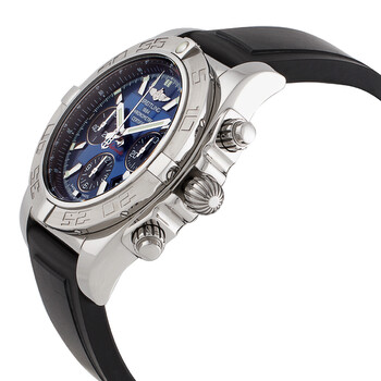 Steel case with a diver pro ii bracelet. Unidirectional ratcheted steel bezel. Blue dial with luminous hands and stick hour markers. Minute markers. Tachymeter scale around the outer rim. Luminescent hands and markers. Date displays at the 3 o'clock position. Chronograph - three sub-dials displaying: 1/4th second, 30 minutes and 12 hours. Self winding mechanical movement. Scratch resistant sapphire crystal. Screw locked crown with two gaskets. Solid case back. Case diameter: 43.70 mm. Case thickness: 17.10 mm. Deployment clasp. Water resistant at 300 meters/ 1000 feet. Functions: hours, minutes, seconds, date, chronograph, tachymeter. Breitling Chronomat Men's Blue Dial Chronograph Watch AB011011-C789BKPD