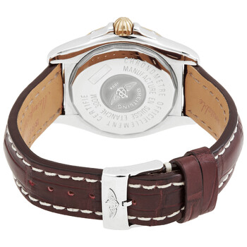 Silver-tone stainless steel case with a crocodile leather strap. Uni-directional rotating yellow gold bezel set with diamonds. Beige dial with rose gold-tone hands and index hour markers. Roman numeral marker at the 12 o'clock position. Minute markers around the outer rim. Dial Type: Analog. Date display at the 3 o'clock position. Breitling Calibre 49 Automatic movement, based upon ETA 2896, containing 21 Jewels, bitting at 28800 vph, and has a power reserve of approximately 42 hours. Scratch resistant sapphire crystal. Screw down crown. Round case shape, case size: 40 mm, case thickness: 14 mm. Band width: 20 mm. Tang clasp. Water resistant at 300 meters / 1000 feet. Functions: big date, hour, minute, second, chronometer. Windrider Cockpit Series. Luxury watch style. Watch label: Swiss Made. Breitling Windrider Cockpit Automatic Chronometer Diamond Men's Watch C4935053/G625.720P.A18BA.1.