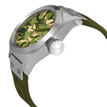 Stainless steel case with a green rubber strap. Fixed stainless steel bezel. Green camouflage dial with green hands and index hour markers. Dial Type: Analog. Date display at the 3 o'clock position. Quartz movement. Scratch resistant sapphire crystal. Screw down crown. Solid case back. Round case shape. Case size: 45 mm. Tang clasp. Water resistant at 100 meters / 330 feet. Functions: date, hour, minute, second. Eterno Solotempo Series. Casual watch style. Brera Orologi Eterno Solotempo Quartz Green Dial Men's Watch BRETS4581.