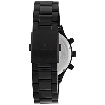 Black ion-plated stainless steel case and bracelet. Fixed black ion-plated bezel. Grey dial with luminous black hands and Arabic numeral / index hour markers. Minute markers around the outer rim. Dial Type: Analog. Luminescent hands. Date display at the 4 o'clock position. Chronograph - three sub-dials displaying: 60 second and 30 minute and 24 hour. Miyota caliber JS05 quartz movement. Scratch resistant sapphitek crystal. Pull / push crown. Solid case back engraved with Brooklyn bridge logo. Round case shape. Case size: 44 mm. Case thickness: 12.65 mm. Band width: 22 mm. Tang clasp. Water resistant at 100 meters / 330 feet. Functions: chronograph, day, GMT, hour, minute, second. Sport watch style. Watch label: Japan Movt. Brooklyn Watch Co. Bedford Brownstone II Quartz Grey Dial Men's Watch 308-GRY-1.