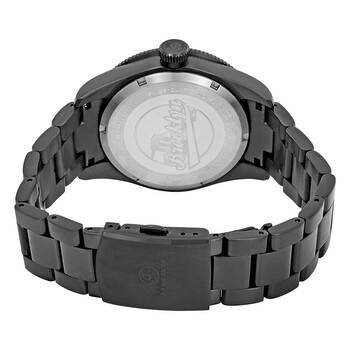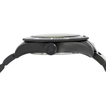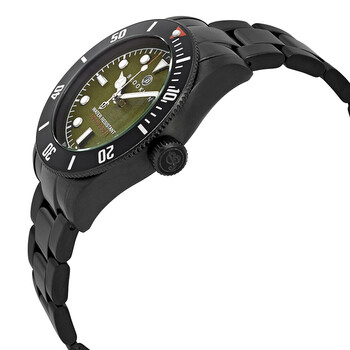 Black ion-plated stainless steel case and bracelet. Uni-directional rotating black ion-plated bezel. Green dial with luminous silver-tone Mercedes-logo, sword, and Breguet-style hands and dot hour markers. Minute markers around the outer rim. Dial Type: Analog. Luminescent hands and markers. ISA caliber 2331/103 quartz movement. Scratch resistant sapphitek crystal. Pull / push crown. Solid case back. Round case shape. Case size: 41 mm. Case thickness: 12 mm. Band width: 20 mm. Deployment clasp with a push button release. Water resistant at 100 meters / 330 feet. Functions: hour, minute, second. Sport watch style. Watch label: Swiss Made. Brooklyn Watch Co. Black Eyed Pea Green Dial Men's Watch 306-D-88-BB-BLK.