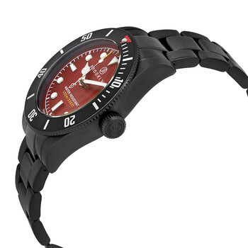Black ion-plated stainless steel case and bracelet. Uni-directional rotating black ion-plated bezel. Red dial with luminous silver-tone Mercedes-logo, sword, and Breguet-style hands and dot hour markers. Minute markers around the outer rim. Dial Type: Analog. Luminescent hands and markers. ISA caliber 2331/103 quartz movement. Scratch resistant sapphitek crystal. Pull / push crown. Solid case back. Round case shape. Case size: 41 mm. Case thickness: 12 mm. Band width: 20 mm. Deployment clasp with a push button release. Water resistant at 100 meters / 330 feet. Functions: hour, minute, second. Sport watch style. Watch label: Swiss Made. Brooklyn Watch Co. Black Eyed Pea Red Dial Men's Watch 306-C-55-BB-BLK.
