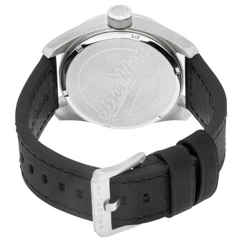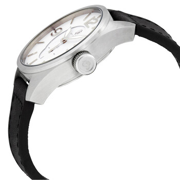 Silver-tone stainless steel case with a black leather strap. Fixed brushed silver-tone stainless steel bezel. White dial with silver-tone plongeur-shaped hands and applied silver-tone index hour markers. Arabic numerals mark the 3, 9 and 12 o'clock positions. Dial Type: Analog. Luminescent hands. One subdial displaying: small second. Ronda Caliber 1069 quartz movement. Scratch resistant sapphire crystal. Uniquely embossed solid case back. Round case shape, case size: 44 mm, case thickness: 12.8 mm. Band width: 22 mm, band length: 8 inches. Tang clasp. Water resistant at 50 meters / 165 feet. Functions: hour, minute, small second. Lafayette Series. Casual watch style. Watch label: Swiss Movt. Item Variations: CLA D, CLA.D, CLAD. Brooklyn Watch Co. Lafayette White Dial Black Leather Swiss Quartz Men's Watch CLA-D.