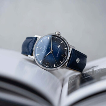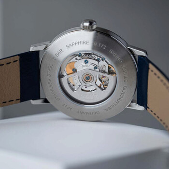 The Stuttgart model series is a tribute to the founder's Swabian homeland, Bruno Söhnle himself. Silver-tone stainless steel case with a blue calfskin band. Fixed silver-tone stainless steel bezel. Blue dial with silver-tone hands and Arabic numeral & index hour markers. Minute markers around the outer rim. Dial Type: Analog. Date display at the 4 o'clock position. Sellita Caliber SW200-1 Automatic movement, containing 26 Jewels, bitting at 28800 vph, and has a power reserve of approximately 38 hours. Scratch resistant sapphire crystal. Transparent case back. Round case shape, case size: 42 mm, case thickness: 10.8 mm. Band width: 22 mm. Buckle clasp. Water resistant at 50 meters / 165 feet. Functions: date, hour, minute, second. Stuttgart Series. Casual watch style. Bruno Sohnle Stuttgart Automatic Blue Dial Men's Watch 17-12173-361.