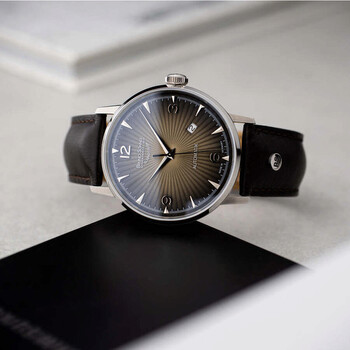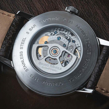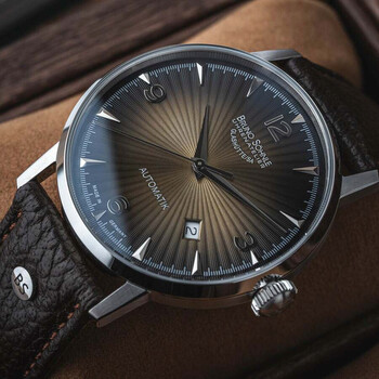 The Stuttgart model series is a tribute to the founder's Swabian homeland, Bruno Söhnle himself. Silver-tone stainless steel case with a silver-tone calfskin band. Fixed silver-tone stainless steel bezel. Brown dial with silver-tone hands and Arabic numeral & index hour markers. Minute markers around the outer rim. Dial Type: Analog. Date display at the 4 o'clock position. Sellita Caliber SW200-1 Automatic movement, containing 26 Jewels, bitting at 28800 vph, and has a power reserve of approximately 38 hours. Scratch resistant sapphire crystal. Transparent case back. Round case shape, case size: 42 mm, case thickness: 10.8 mm. Band width: 22 mm. Buckle clasp. Water resistant at 50 meters / 165 feet. Functions: date, hour, minute, second. Stuttgart Series. Casual watch style. Bruno Sohnle Stuttgart Automatic Brown Dial Men's Watch 17-12173-261.