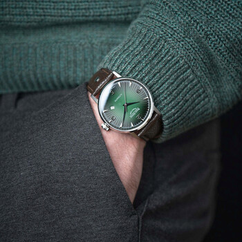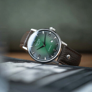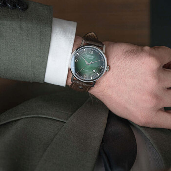 The Stuttgart model series is a tribute to the founder's Swabian homeland, Bruno Söhnle himself. Silver-tone stainless steel case with a brown calfskin band. Fixed silver-tone stainless steel bezel. Green dial with silver-tone hands and Arabic numeral & index hour markers. Minute markers around the outer rim. Dial Type: Analog. Date display at the 4 o'clock position. Sellita Caliber SW200-1 Automatic movement, containing 26 Jewels, bitting at 28800 vph, and has a power reserve of approximately 38 hours. Scratch resistant sapphire crystal. Transparent case back. Round case shape, case size: 42 mm, case thickness: 10.8 mm. Band width: 22 mm. Buckle clasp. Water resistant at 50 meters / 165 feet. Functions: date, hour, minute, second. Stuttgart Series. Casual watch style. Bruno Sohnle Stuttgart Automatic Green Dial Men's Watch 17-12173-661.