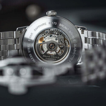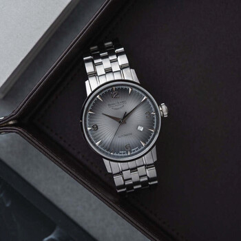 The Stuttgart model series is a tribute to the founder's Swabian homeland, Bruno Söhnle himself. Silver-tone stainless steel case and bracelet. Fixed silver-tone stainless steel bezel. Grey dial with silver-tone hands and Arabic numeral & index hour markers. Minute markers around the outer rim. Dial Type: Analog. Date display at the 4 o'clock position. Sellita Caliber SW200-1 Automatic movement, containing 26 Jewels, bitting at 28800 vph, and has a power reserve of approximately 38 hours. Scratch resistant sapphire crystal. Transparent case back. Round case shape, case size: 42 mm, case thickness: 10.8 mm. Band width: 22 mm. Fold over clasp. Water resistant at 50 meters / 165 feet. Functions: date, hour, minute, second. Stuttgart Series. Casual watch style. Bruno Sohnle Stuttgart Automatic Grey Dial Men's Watch 17-12173-862.