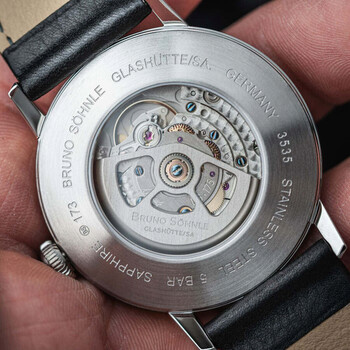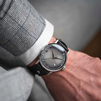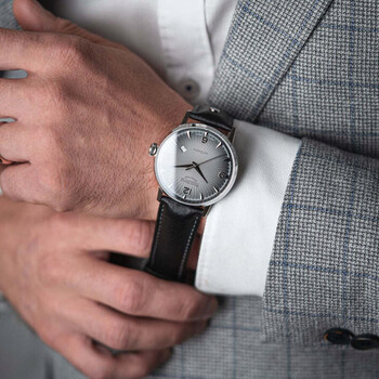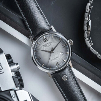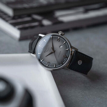 The Stuttgart model series is a tribute to the founder's Swabian homeland, Bruno Söhnle himself. Silver-tone stainless steel case with a black calfskin band. Fixed silver-tone stainless steel bezel. Grey dial with silver-tone hands and Arabic numeral & index hour markers. Minute markers around the outer rim. Dial Type: Analog. Date display at the 4 o'clock position. Sellita Caliber SW200-1 Automatic movement, containing 26 Jewels, bitting at 28800 vph, and has a power reserve of approximately 38 hours. Scratch resistant sapphire crystal. Transparent case back. Round case shape, case size: 42 mm, case thickness: 10.8 mm. Band width: 22 mm. Fold over clasp. Water resistant at 50 meters / 165 feet. Functions: date, hour, minute, second. Stuttgart Series. Casual watch style. Bruno Sohnle Stuttgart Automatic Grey Dial Men's Watch 17-12173-861.