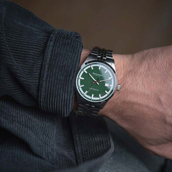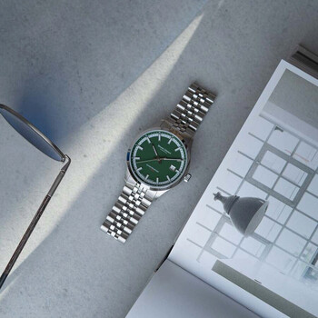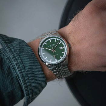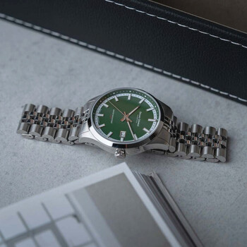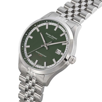 The Turin family is characterized by the sporty elegant appearance. It is a timepiece for every day. Silver-tone stainless steel case and bracelet. Fixed silver-tone stainless steel bezel. Green dial with silver-tone hands and index hour markers. Minute markers around the outer rim. Dial Type: Analog. Luminescent hands and markers. Date display at the 3 o'clock position. Sellita Caliber SW 200 Automatic movement, based upon ETA 2824-2, containing 26 Jewels, bitting at 28800 vph, and has a power reserve of approximately 38 hours. Scratch resistant sapphire crystal. Pull / push crown. Transparent case back. Round case shape, case size: 39.5 mm, case thickness: 11.8 mm. Band width: 20 mm. Fold over clasp with a safety release. Water resistant at 100 meters / 330 feet. Functions: date, hour, minute, second. Turin Series. Casual watch style. Bruno Sohnle Turin Automatic Green Dial Men's Watch 17-12230-442.