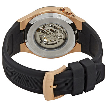 Rose gold-tone stainless steel case with a black silicone strap. Fixed black-plated bezel. Black skeleton dial with luminous rose gold-tone hands and index hour markers. A Roman numeral appears at the 12 o'clock position. Minute markers around the outer rim. Dial Type: Analog. Luminescent hands and markers. Automatic movement with a 40-hour power reserve. Scratch resistant sapphire crystal. Pull / push crown. Transparent case back. Round case shape. Case size: 46 mm. Case thickness: 13.2 mm. Band width: 27 mm. Tang clasp. Water resistant at 100 meters / 330 feet. Functions: hour, minute, second. Casual watch style. Bulova Classic Automatic Black Dial Black Silicone Men's Watch 98A177.