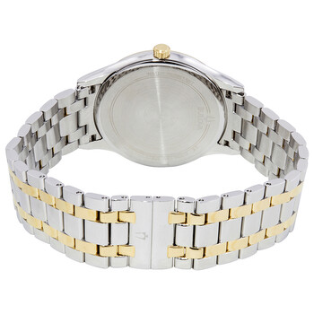 Silver-tone stainless steel case with a two-tone (silver-tone and gold-tone) stainless steel bracelet. Fixed gold-tone stainless steel bezel. Blue dial with gold-tone hands and diamond hour markers. Roman numerals mark the 3, 6, 9 and 12 o'clock positions. Dial Type: Analog. Date display above the 6 o'clock position. Quartz movement. Scratch resistant mineral crystal. Pull / push crown. Solid case back. Round case shape, case size: 40 mm, case thickness: 6.7 mm. Band width: 20 mm. Fold over clasp. Water resistant at 30 meters / 100 feet. Functions: date, hour, minute, second. Additional Info: in general, withstands splashes or brief immersion in water, but not suitable for swimming or bathing. Diamond Series. Dress watch style. Bulova Classic Diamond Blue Dial Men's Watch 98D130.