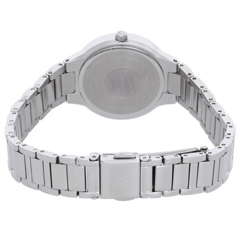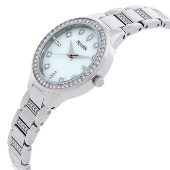 Silver-tone stainless steel case and bracelet. Fixed silver-tone bezel with crystal set. White dial with silver-tone hands and index hour markers. Dial Type: Analog. Quartz movement. Scratch resistant mineral crystal. Solid case back. Round case shape, case size: 30 mm. Band width: 18 mm, band length: 7.5 inches. Fold over clasp with a safety release. Water resistant at 30 meters / 100 feet. Functions: hour, minute, second. Additional Info: includes a matching heart-shaped pendant set with 97 crystal. Classic Series. Fashion watch style. Bulova Classic Quartz Crystal White Dial Ladies Watch and Necklace Set 96X162.