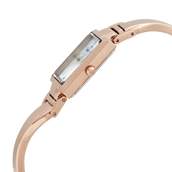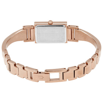 Rose gold-tone stainless steel case and bracelet. Fixed rose gold-tone bezel. Mother of pearl dial with rose gold-tone hands. Diamonds mark the 3, 6 and 9 o'clock positions. Dial Type: Analog. Quartz movement. Scratch resistant mineral crystal. Pull / push crown. Solid case back. Rectangle case shape. Case dimensions: 33 mm x 18 mm. Case thickness: 6.95 mm. Band width: 14 mm. Jewelry clasp. Water resistant at 30 meters / 100 feet. Functions: hour, minute. Classic Series. Casual watch style. Bulova Classic Quartz Diamond Mother of Pearl Dial Ladies Watch 97P142.
