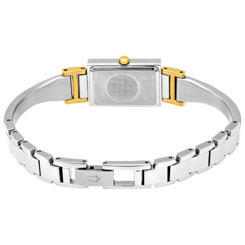 Stainless steel case with a two-tone (silver-tone and yellow gold-tone) stainless steel bracelet. Fixed stainless steel bezel. Mother of pearl dial with yellow gold-tone hands. Diamonds mark the 3, 6 and 9 o'clock positions. Dial Type: Analog. Quartz movement. Scratch resistant mineral crystal. Pull / push crown. Solid case back. Rectangle case shape. Case thickness: 33 mm x 18 mm. Case thickness: 6.95 mm. Band width: 14 mm. Water resistant at 30 meters / 100 feet. Functions: hour, minute. Classic Series. Casual watch style. Bulova Classic Quartz Diamond Mother of Pearl Dial Ladies Watch 98P188.