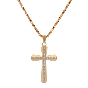 A cross pendant in gold-tone stainless steel, set with crystals from end-to-end is included