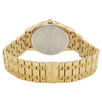 Yellow gold-tone stainless steel case and bracelet. Fixed yellow gold-tone bezel. Black dial with yellow gold-tone hands and diamond hour markers. Roman numerals mark the 3, 6, 9 and 12 o'clock positions. Dial Type: Analog. Date display above the 6 o'clock position. Quartz movement. Scratch resistant mineral crystal. Pull / push crown. Solid case back. Round case shape. Case size: 40 mm. Case thickness: 6.7 mm. Band width: 20 mm. Double press deployment clasp. Water resistant at 30 meters / 100 feet. Functions: hour, minute, second. Additional Info: in general, withstands splashes or brief immersion in water, but not suitable for swimming or bathing. Dress watch style. Bulova Diamond Black Dial Men's Watch 97D108.
