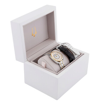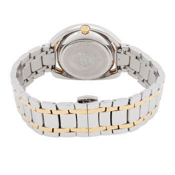 Two-tone (silver-tone and gold-tone) stainless steel case and bracelet. Fixed gold-tone stainless steel bezel. Mother of pearl dial with rose gold-tone hands and index hour markers. Dial Type: Analog. Luminescent hands. Bulova Calibre 2025 quartz movement. Scratch resistant sapphire crystal. Pull / push crown. Solid case back. Cushion case shape, case size: 34 mm. Band width: 16 mm. Deployment with push button release clasp. Water resistant at 30 meters / 100 feet. Duality Series. Dress watch style. Bulova Duality Quartz Ladies Watch 98X134.