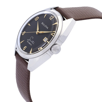 Silver-tone stainless steel case with a brown leather strap. Fixed bezel. Black dial with gold-tone hands and Arabic numeral and index hour markers. Dial Type: Analog. Date display at the 3 o'clock position. Miyota Caliber 8215 Automatic movement, containing 21 Jewels, bitting at 21600 vph, and has a power reserve of approximately 42 hours. Scratch resistant sapphire crystal. Pull / push crown. Transparent see through case back. Round case shape, case size: 39 mm, case thickness: 12 mm. Deployment with push button release clasp. Water resistant at 30 meters / 100 feet. Functions: date, hour, minute, second. Fly Me To The Moon Series. Dress watch style. Watch label: Japan Movt. Bulova Fly Me To The Moon Automatic Black Dial Men's Watch 96B348.