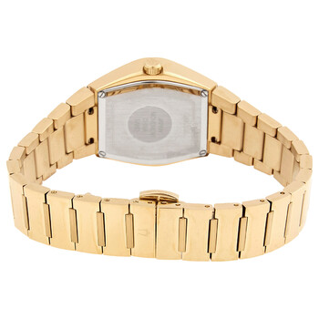 Yellow gold-tone stainless steel case and bracelet. Fixed black bezel. Black dial with gold-tone hands. Index markers appear at the 3, 6, 9 and 12 o'clock positions. Dial Type: Analog. Bulova Calibre GL34 quartz movement. Scratch resistant curved mineral crystal. Pull / push crown. Solid case back. Tonneau case shape, case size: 30 mm, case thickness: 8.45 mm. Fold over clasp with a push button release. Water resistant at 30 meters / 100 feet. Functions: hour, minute, second. Gemini Series. Casual watch style. Bulova Quartz Black Dial Ladies Watch 97L164.