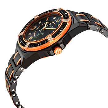 Black ceramic case with a black ceramic bracelet with rose gold-tone links. Fixed rose gold-tone bezel with black ceramic inlays set with diamonds. Black mother of pearl dial with luminous rose gold-tone hands and alternating diamond and Roman numeral hour markers. Dial Type: Analog. Luminescent hands. Date display at the 3 o'clock position. Quartz movement. Scratch resistant sapphire crystal. Screw down crown. Solid case back. Round case shape. Case size: 39 mm. Case thickness: 10.9 mm. Band width: 18 mm. Fold over clasp with a push button release. Water resistant at 100 meters / 330 feet. Functions: date, hour, minute, second. Marine Star Series. Casual watch style. Bulova Marine Star Black Mother of Pearl Diamond Dial Ladies Watch 98R242.