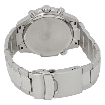 Stainless steel case with a stainless steel bracelet. Fixed stainless steel bezel. Blue dial with luminous silver-tone hands and index hour markers. Minute markers around the outer rim. Dial Type: Analog. Luminescent hands and markers. Date display between the 4 and 5 o'clock positions. Chronograph - three sub-dials displaying: 60 second, 60 minute and 1/10th of a second. Quartz movement. Scratch resistant mineral crystal. Screw down crown. Solid case back. Round case shape. Case size: 43 mm. Case thickness: 12.2 mm. Band width: 22 mm. Fold over clasp with a safety release. Water resistant at 100 meters / 330 feet. Functions: chronograph, date, hour, minute, second. Sport watch style. Bulova Marine Star Chronograph Blue Dial Men's Watch 96B256.