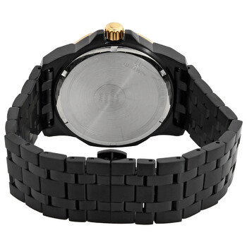 Black ion-plated stainless steel case and bracelet. Fixed gold-plated bezel with an inlaid black ion-plated ring. Black dial with luminous gold-tone hands and diamond hour markers. Roman numerals appear at the 3, 6, 9 and 12 o'clock positions. Minute markers around the outer rim. Dial Type: Analog. Luminescent hands. Date display at the 3 o'clock position. Quartz movement. Scratch resistant mineral crystal. Solid case back. Round case shape. Case size: 44 mm. Deployment clasp with a push button release. Water resistant at 100 meters / 330 feet. Functions: date, hour, minute, second. Marine Star Series. Dress watch style. Bulova Marine Star Quartz Diamond Black Dial Men's Watch 98D176.