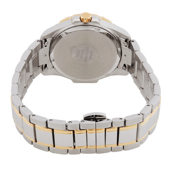 Silver-tone stainless steel case with a two-tone (silver-tone and gold-tone) stainless steel bracelet. Fixed gold-tone stainless steel bezel. Silver dial with gold-tone hands and diamond hour markers. Minute scale around the inner rim. Dial Type: Analog. Luminescent hands. Bulova Calibre 2036 quartz movement. Scratch resistant sapphire crystal. Solid case back. Round case shape, case size: 36 mm. Band width: 18 mm. Deployment with push button release clasp. Water resistant at 100 meters / 330 feet. Functions: hour, minute, second. Marine Star Series. Dress watch style. Bulova Marine Star Quartz Diamond Silver Dial Ladies Watch 98P227.